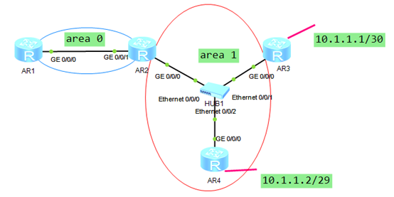 该拓扑中,AR3和AR4分别宣告了10.1.1.0/30 10.1.1.0/29两个网段,这两个网段前缀相同,掩码不同。为了区别LSA,AR2作为ABR,将这两条网段转换成三类LSA时,会把掩码短的网段10.1.1.0/29对应LSA的LS-ID设为10.1.1.0,把掩码长的网段10.1.1.0/30对应LSA的IS-ID设为该网段的广播地址10.1.1.3,以区别这两条三类LSA。如下图: